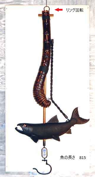 商品番号の数字は支柱の長さを表しています。単位は全て ミリ です。 背景の板はベニヤ板です(910×1820)。大きさの目安にして下さい。 マスノスケ1043(キングサーモン) 全長1760〜2060。灰から吊るす面までの距離が2410以上必要。 適合囲炉裏は灰面積1.u以上 自重9.2キロ 魚の全長815 自在鉤のページ