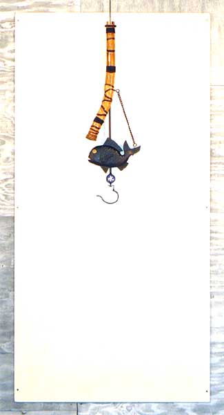商品番号の数字は支柱の長さを表しています。単位は全て ミリ です。 背景の板はベニヤ板です(910×1820)。大きさの目安にして下さい。 鯛567 全長840〜1040。灰から吊るす面までの距離が1390以上必要。 適合囲炉裏は灰面積0.15〜0.4u 自重1.3キロ 魚の全長258 自在鉤のページ
